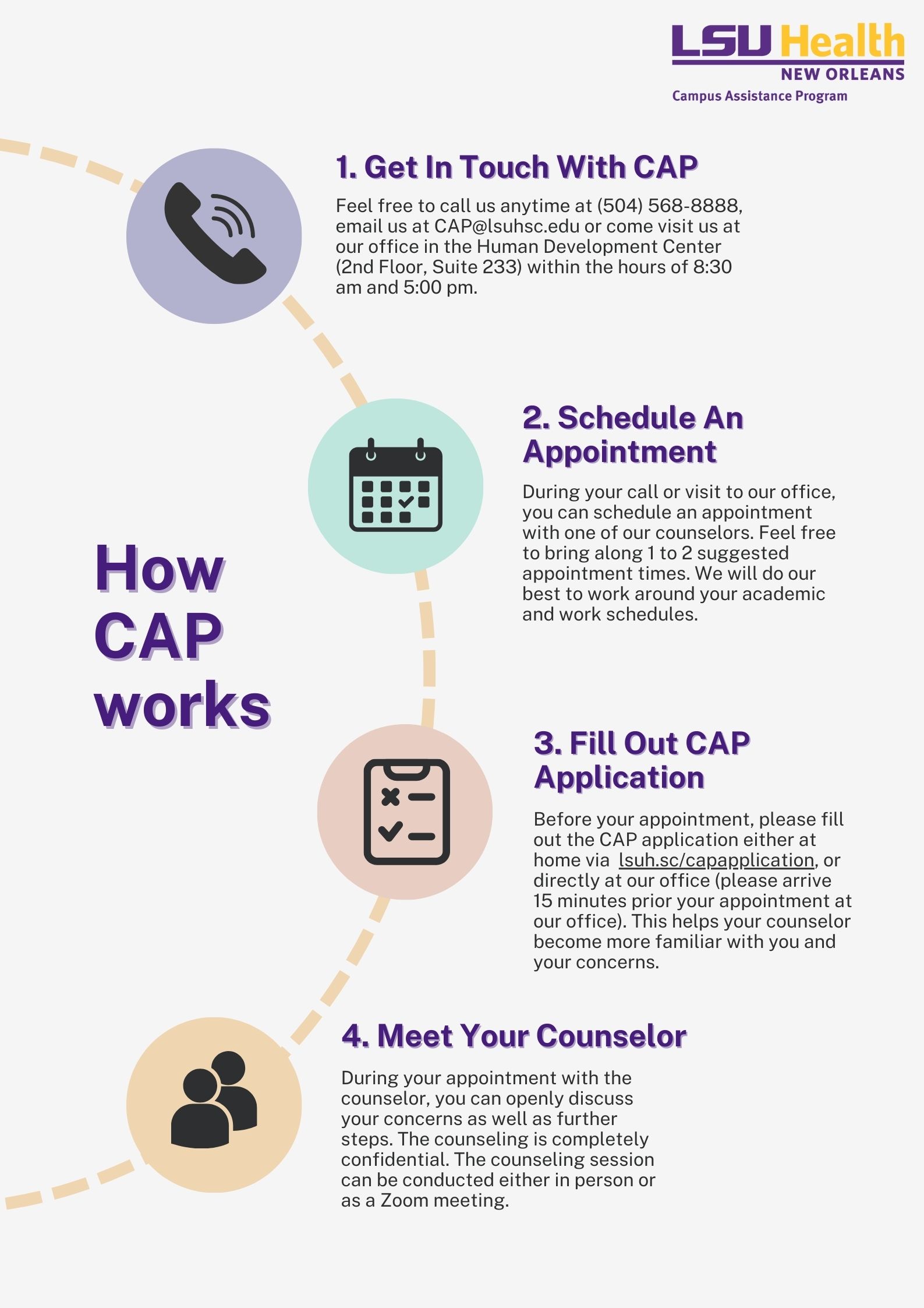 The mission of the LSUHSC Campus Assistance Program (CAP) is to support the mental, emotional, and physical well-being of students, faculty, staff, and immediate family members in order to promote the overall health and effectiveness of the LSUHSC-NO community.