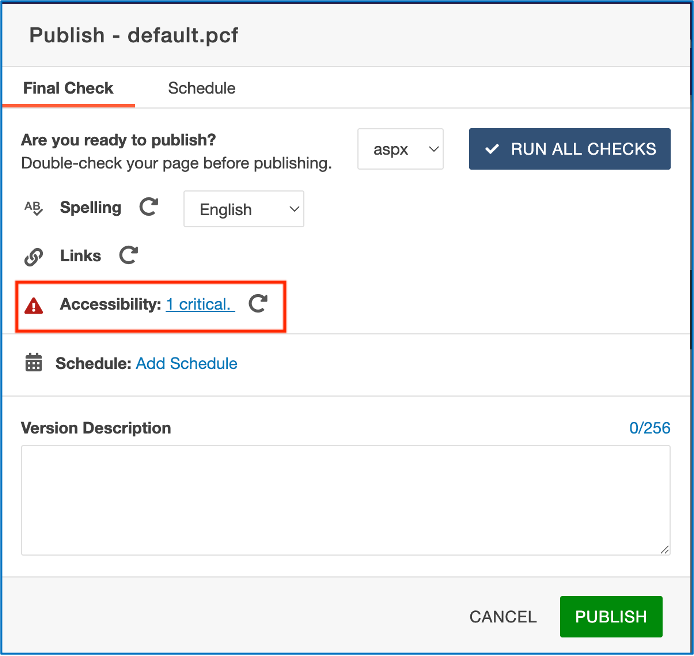 - When you select “Publish,” the Accessibility check in the Final Check section will run automatically and prevent publishing if any issues are found.